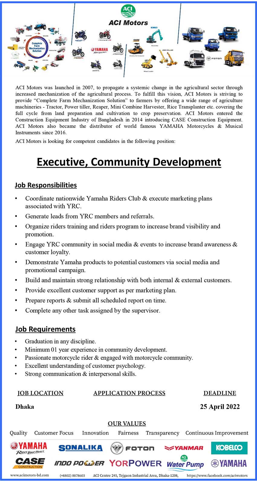ACI Motors Limited job Circular 2022 has been publish. ACI Motors was introduced in 2007 to promote a systematic change in the agricultural sector through enhanced mechanization of agricultural processes. chakrirkbr.com. To meet this vision, ACI Motors strives to provide farmers with a “complete farm mechanization solution” by offering a wide range of agricultural machinery – tractors, power tillers, reapers, mini combine harvesters, rice transplanters, etc., covering the entire land preparation cycle. And cultivation for crop preservation. ACI Motors entered the construction equipment industry in Bangladesh in 2014 with the launch of CASE Construction Equipment. ACI Motors became the world famous distributor of Yamaha motorcycles in Bangladesh in 2016. Apply by viewing ACI Motors Limited job Circular 2022.