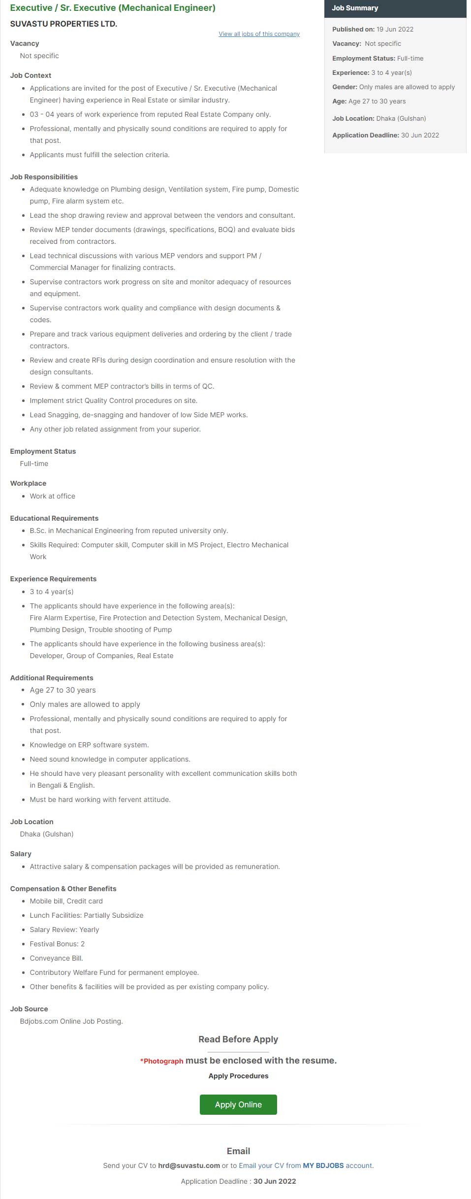 Executive Sr. Executive SUVASTU PROPERTIES LTD Job circular 2022